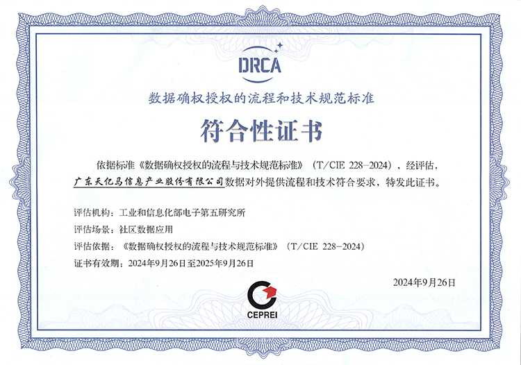 在大会开幕式的重要仪式环节——中国首批数据确权授权标准符合性DRCA证书发布暨跨境数据确权授权服务中心启动仪式环节中,工信部电子五所向包括天亿马在内的七家企业颁发了全国首批“数据确权授权标准符合性DRCA证书”。该证书依据全国首部以数据确权授权命名的标准——《数据确权授权的流程与技术规范》,构建形成可信的数据确权授权合规性评估体系,将推动建立跨区域跨行业身份互认、权益互认、授权互认的数据合规流通互信机制。