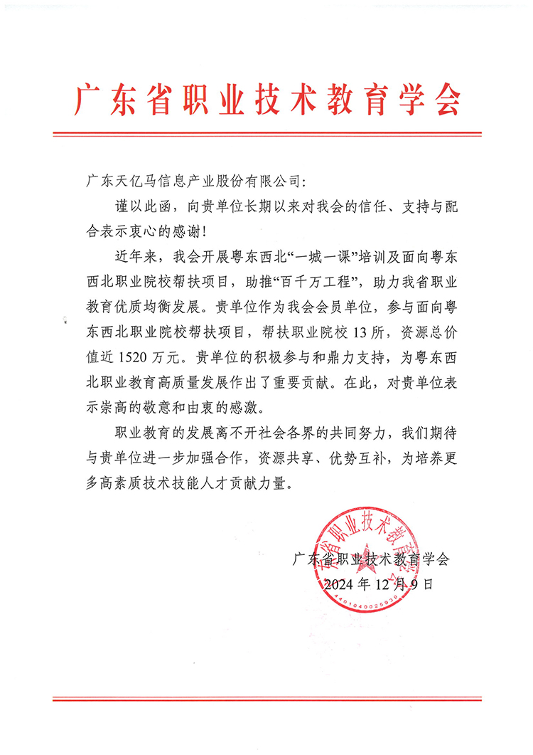 近日,天亿马收到广东省职业技术教育学会的感谢信,信中对公司积极参与面向粤东西北职业院校帮扶项目,支持粤东西北职业教育发展表示了高度肯定。