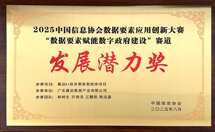 近日,由国家数据局主办、贵州省人民政府承办的2025中国国际大数据产业博览会(简称数博会)在贵州省贵阳市举办。在本次数博会“数字政府”交流活动上,揭晓了2025中国信息协会数据要素应用创新大赛获奖名单。天亿马控股子公司广东翼启数据产业有限公司“翼启AI政务管家智能体项目”荣获“数据要素赋能数字政府建设赛道发展潜力奖”。