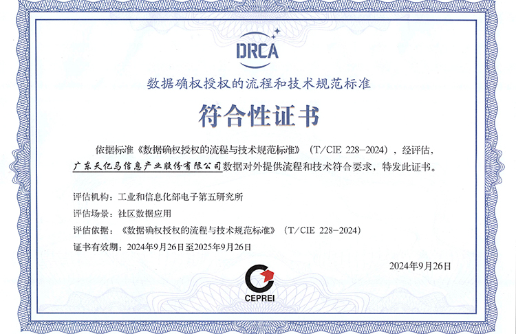 天亿马荣获全国首批DRCA证书,并参与成立跨境数据确权授权服务中心
